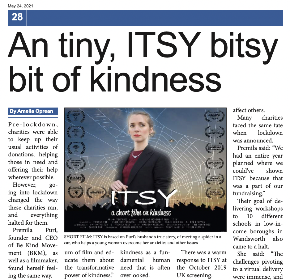 Press Premila Puri In The Irish News Cinemamas: Kindness With Premila Puri The Unexpektedstore: Q&A With Premila Puri Variety: Kindness In Film Summit Wildsound: Interview With Filmmaker Premila Puri (ITSY) Indie Shorts Magazine: ITSY South West Londoner Magazine: ITSY (Page 28) "Investing in Kindness" "Investing in Kindness" "Investing in Kindness"