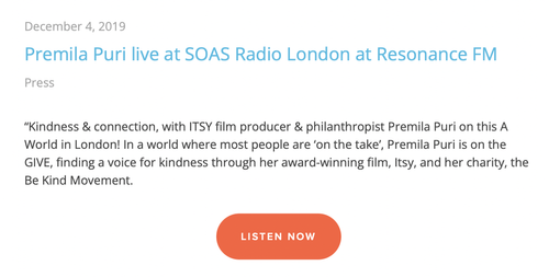 Broadcast Media The Business Awards Show: Interview With Charity Champion Premila Puri RiselQ Podcast: Kindness With Premila Puri The Breakfast Show Podcast: Interview with Premila Puri (from 1:10:50) Riverside Reports Podcast: Interview with Mary Lou (from 44:00) Interview with SOAS Radio "Investing in Kindness" "Investing in Kindness" "Investing in Kindness"